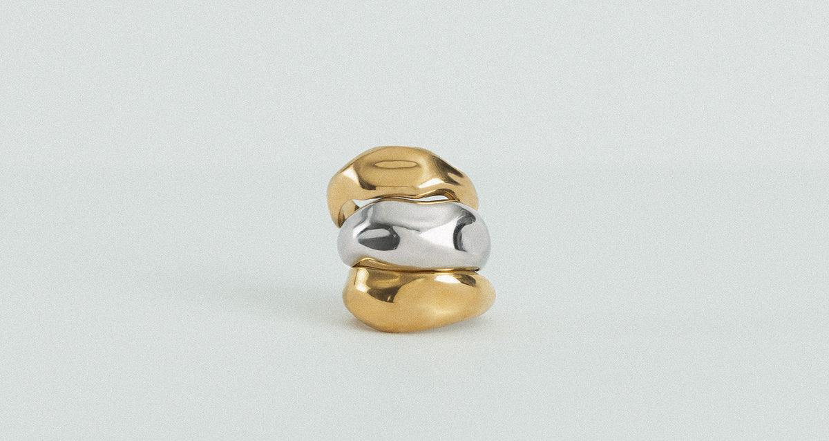 Eine Kollektion von Statement-Ringen, die durch kraftvolle Silhouetten und einzigartige Details gekennzeichnet ist. Hergestellt aus hochwertigem Edelstahl und erhältlich in den Farben Silber und Gold.