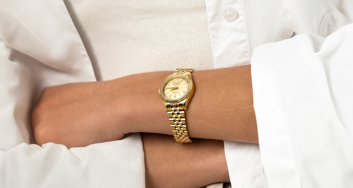 Eine Kollektion von Uhren, die wasserdichte Funktionalität und elegantes Design bieten. Erhältlich in den Farben Gold, Silber und Bic.