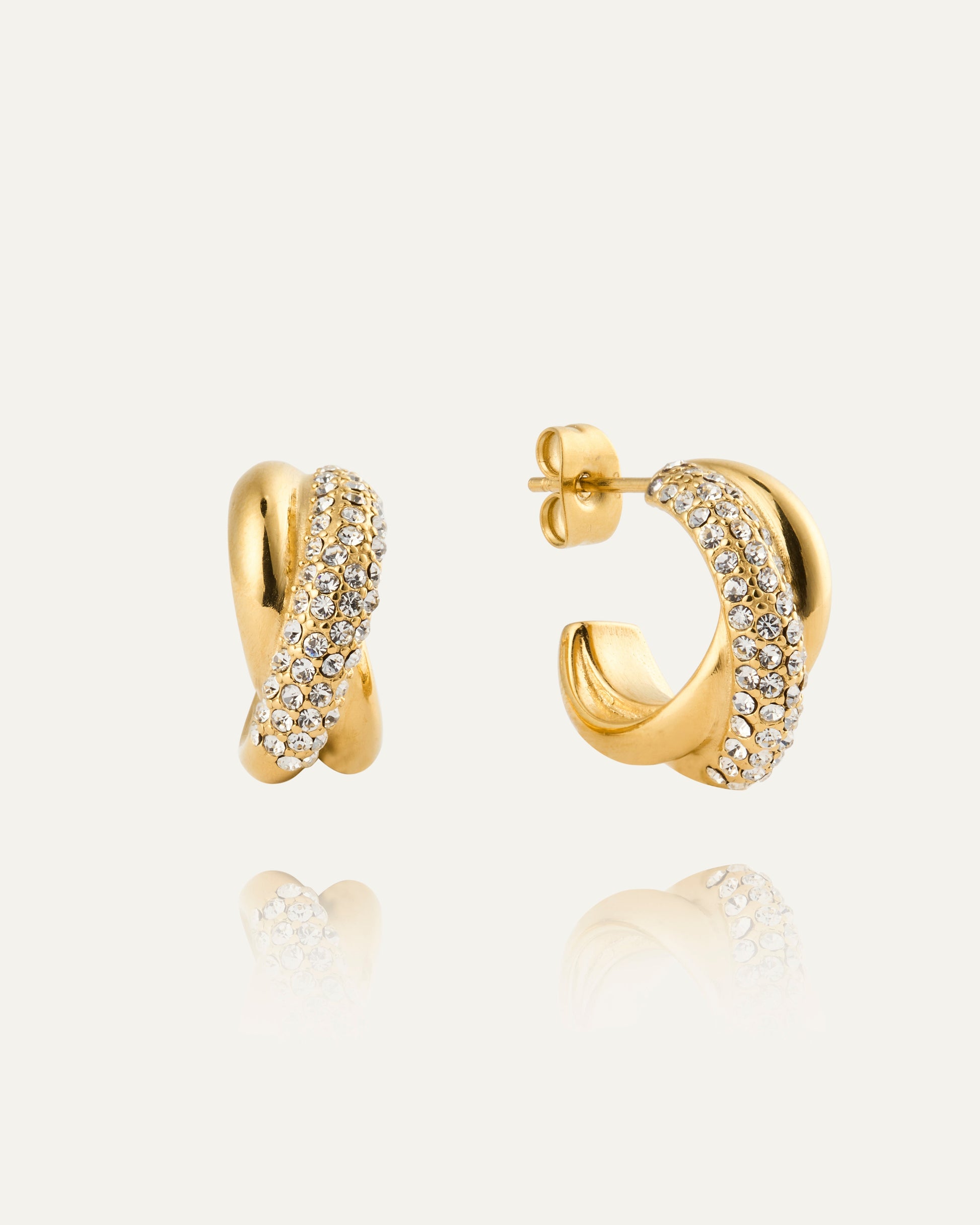 Warmer Glanz in einem filigranen Design. Aurora Gold Hoops verbinden den klassischen Creolenstil mit weißen Preciosa-Steinen und schaffen so einen markanten, aber dennoch weichen Ausdruck – ebenso schön einzeln getragen wie in Kombination mit anderen Schmuckstücken.