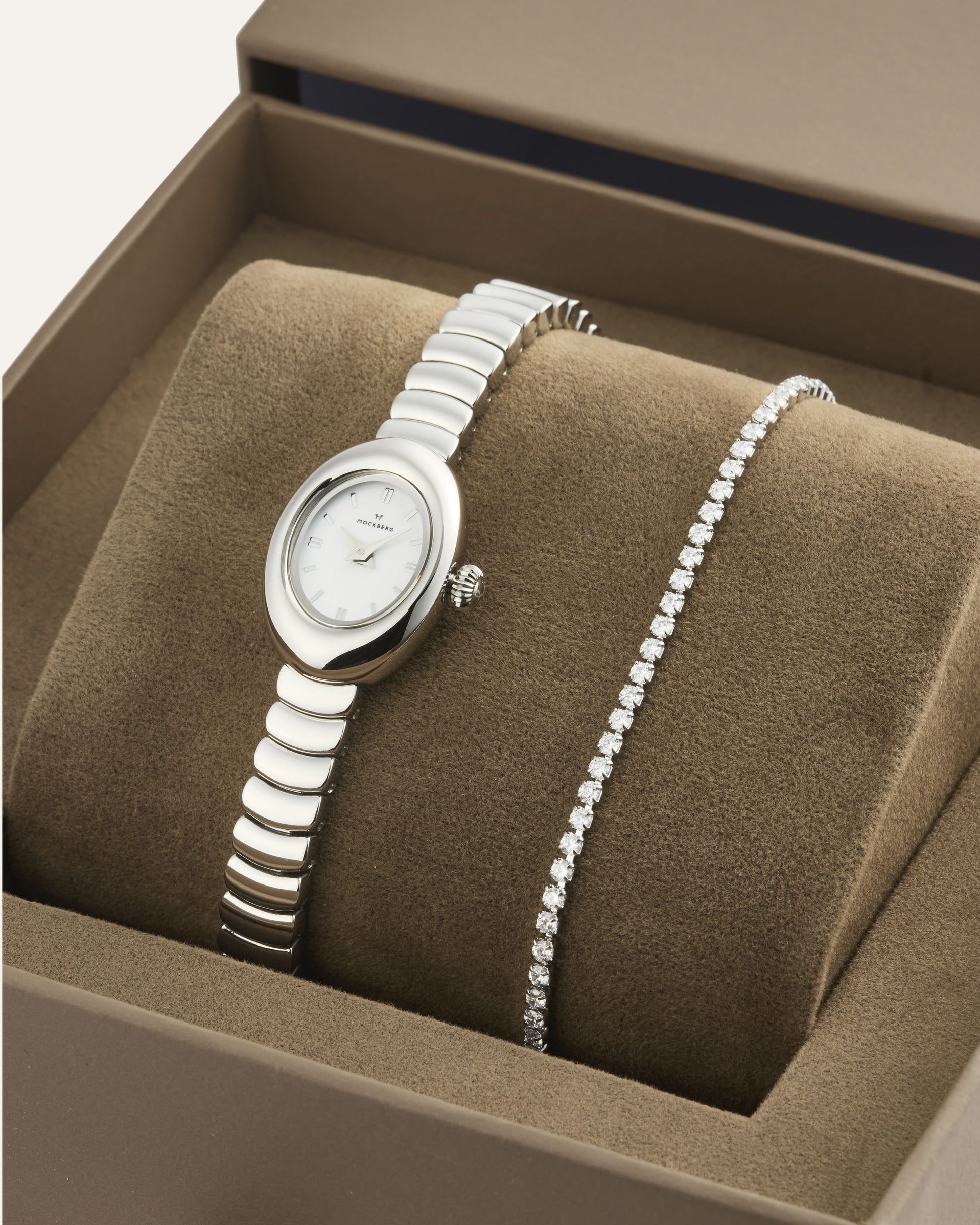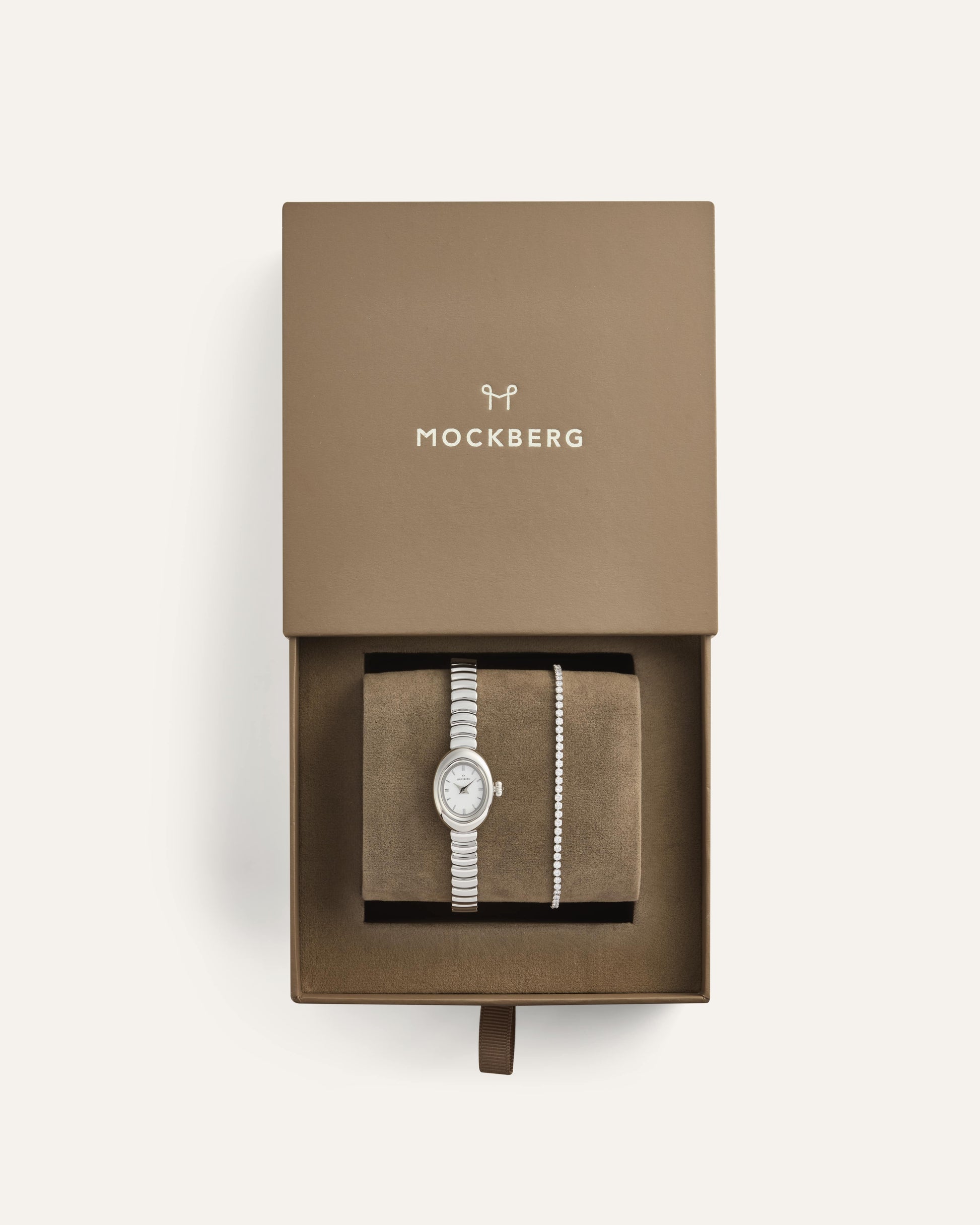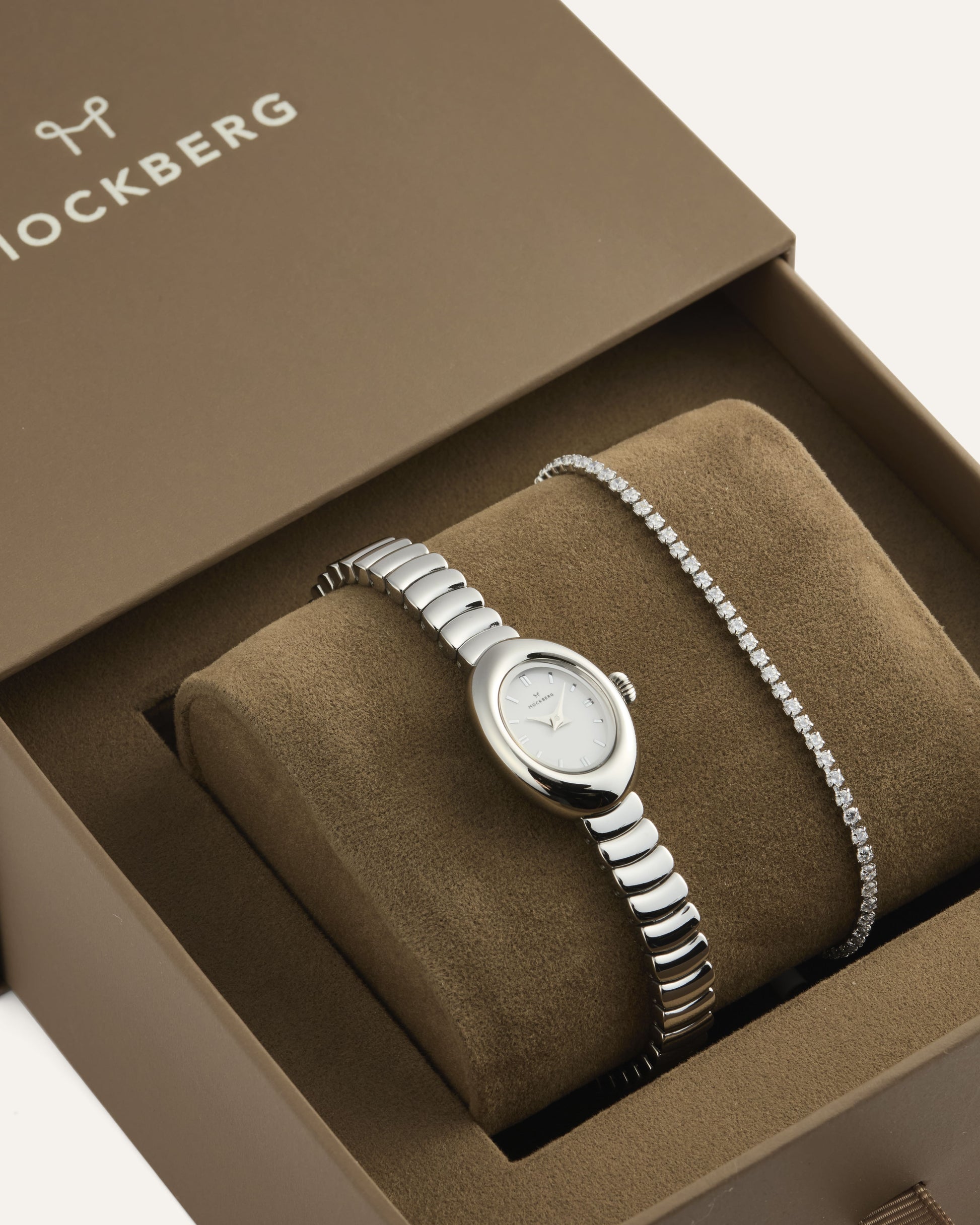 Mockbergs Geschenkset mit der Belle Oval Petite Uhr und dem Armband verleiht einen klassischen, harmonischen Look, der sowohl für den Alltag als auch für besondere Anlässe geeignet ist. Die Kombination ist leicht zu stylen und verleiht Ihrem Outfit eine raffinierte Note, ohne es zu überladen. Uhr und Armband werden gemeinsam in einer Geschenkbox geliefert.