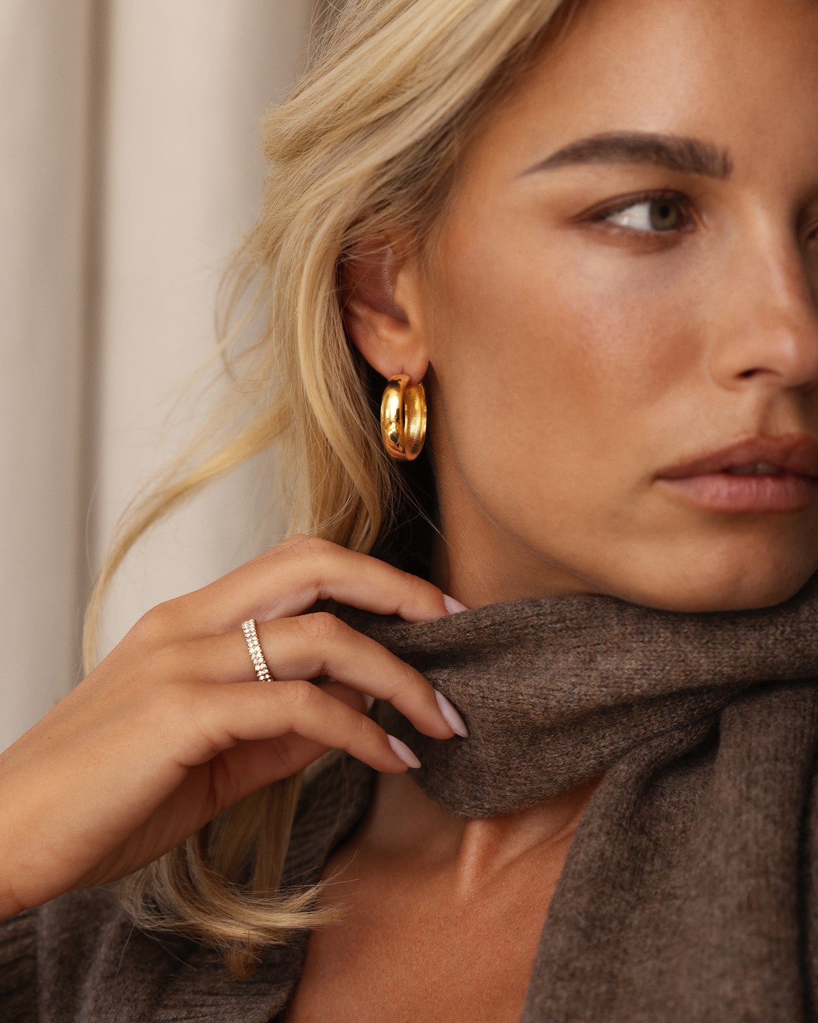 Brave Large Hoops in goldfarbenem Finish überzeugen mit einem sanft gewölbten, kompakten Design, das nah am Ohr anliegt. Aus Edelstahl gefertigt und mittels PVD mit 18K Gold beschichtet, behalten sie ihren Glanz auch bei täglichem Tragen. Trage sie solo für einen klaren Look oder kombiniere sie mit kleineren Steckern für eine persönliche Note.