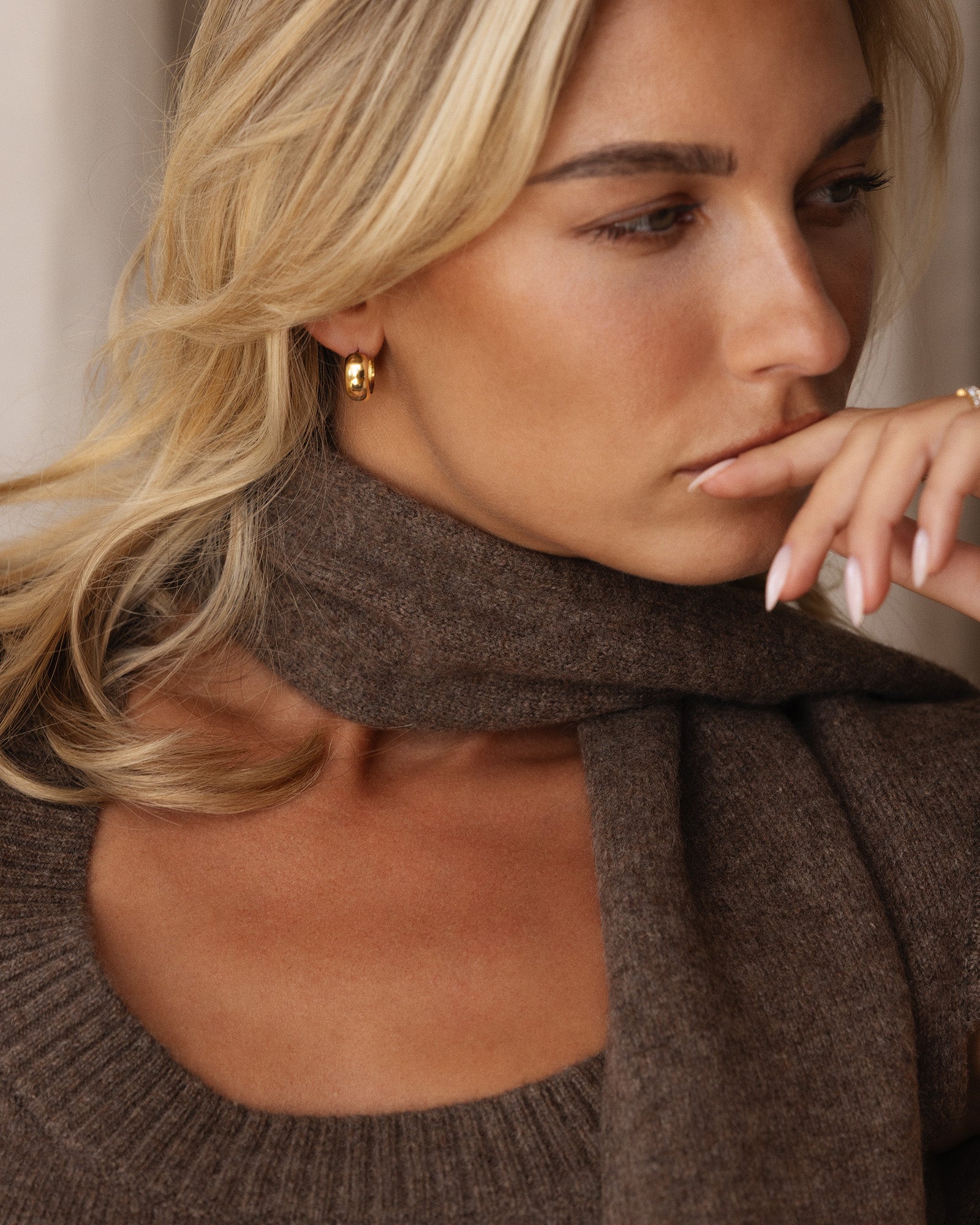 Brave Small Hoops in goldfarbenem Finish überzeugen mit einem sanft gewölbten, kompakten Design, das nah am Ohr anliegt. Aus Edelstahl gefertigt und mittels PVD mit 18K Gold beschichtet, behalten sie ihren Glanz auch bei täglichem Tragen. Die polierte Oberfläche sorgt für einen definierten, zugleich ausgewogenen Look – vom Tag bis in die Nacht. Trage sie solo für einen klaren Look oder kombiniere sie mit kleineren Steckern für eine persönliche Note.