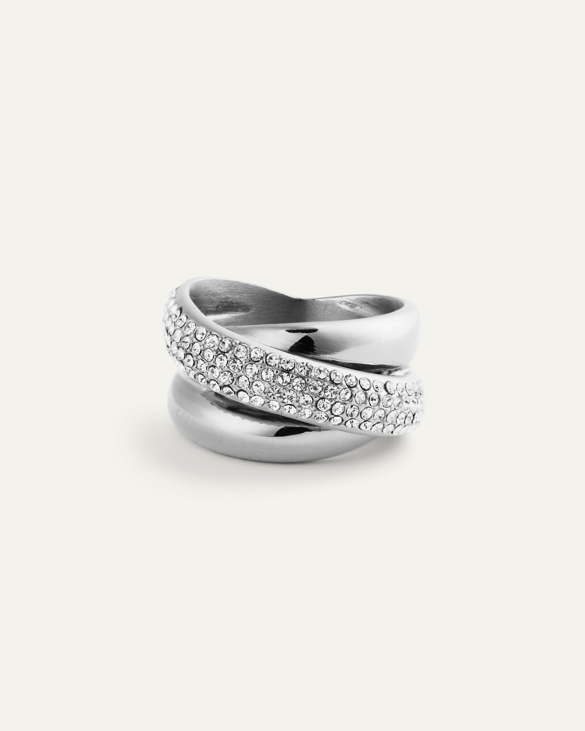 Zwei Welten im Gleichgewicht: Sanft geformtes Metall trifft auf pavégefasste weiße Preciosa-Steine in einer gedrehten Silhouette. Das silberne Finish sorgt für einen kühlen, eleganten Look, der perfekt vom Tag bis in die Nacht passt. Trage sie einzeln für schlichte Eleganz oder gestapelt für zusätzlichen Glanz.