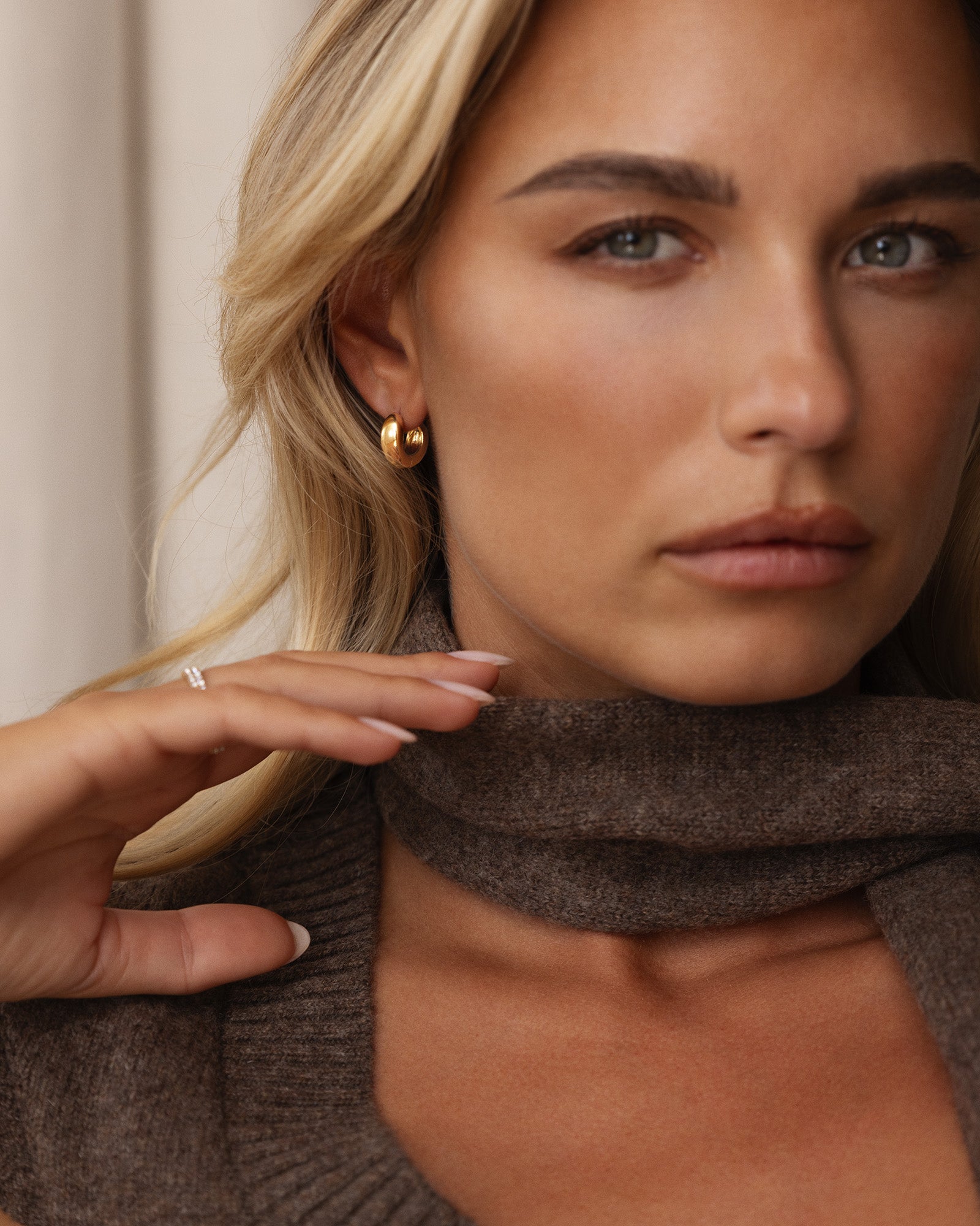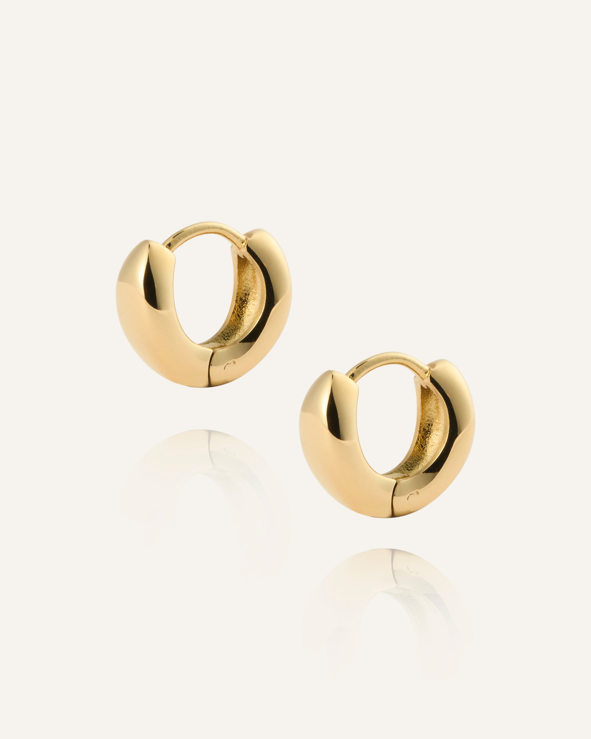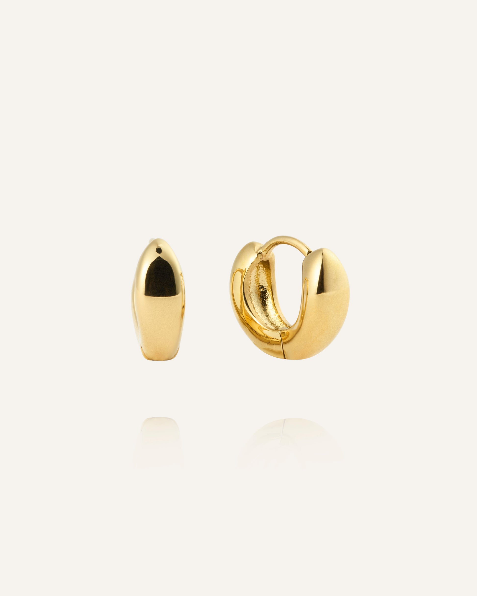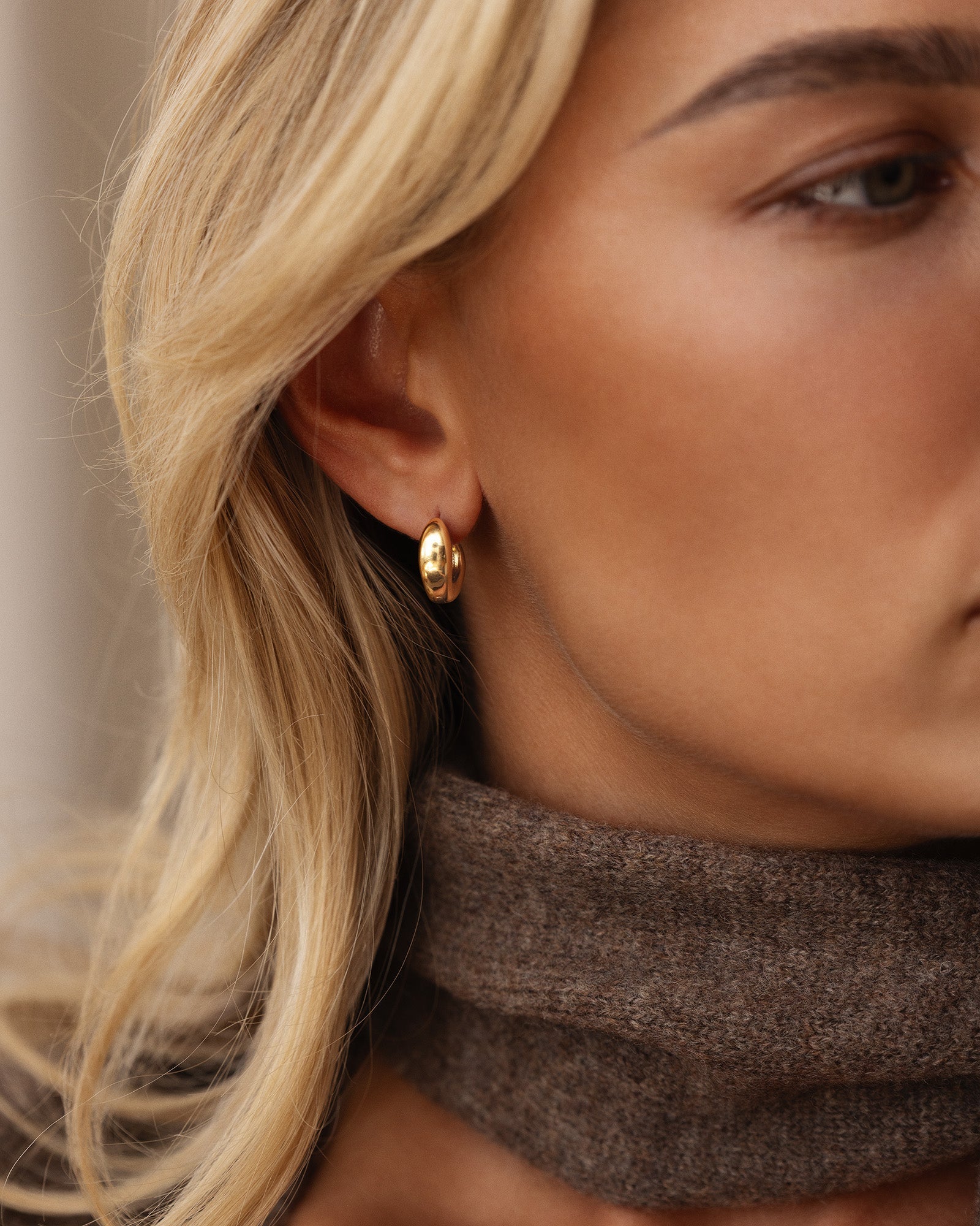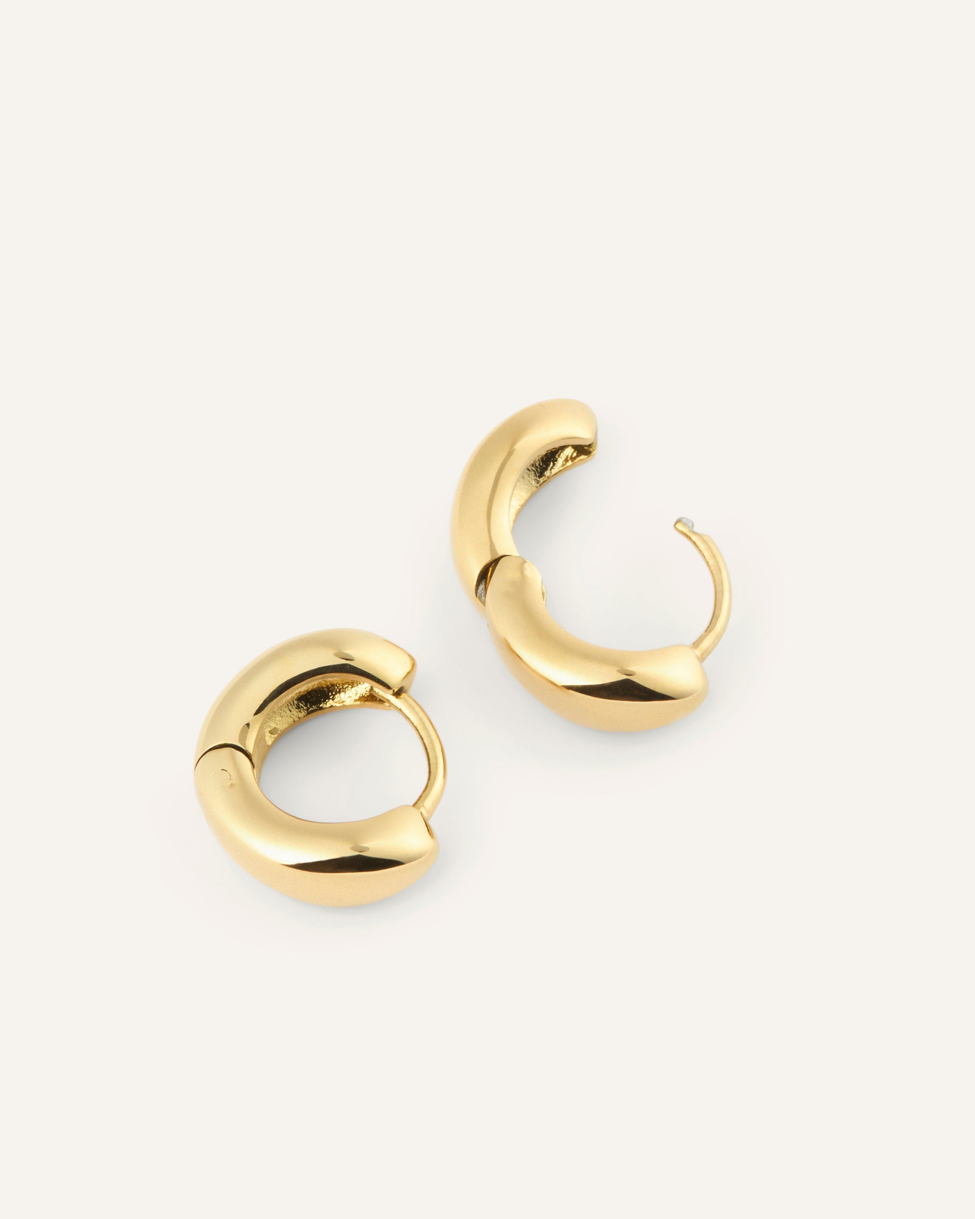 Bulky Huggies in goldfarbener Ausführung zeichnen sich durch weich gerundete, skulpturale Formen aus, die das Licht wunderschön einfangen. Das kompakte Design sorgt für einen definierten, gleichzeitig ausgewogenen Look, der sowohl Alltags- als auch Abendoutfits aufwertet. Tragen Sie sie solo für einen cleanen Stil oder kombinieren Sie sie mit Steckern für eine persönliche Note.