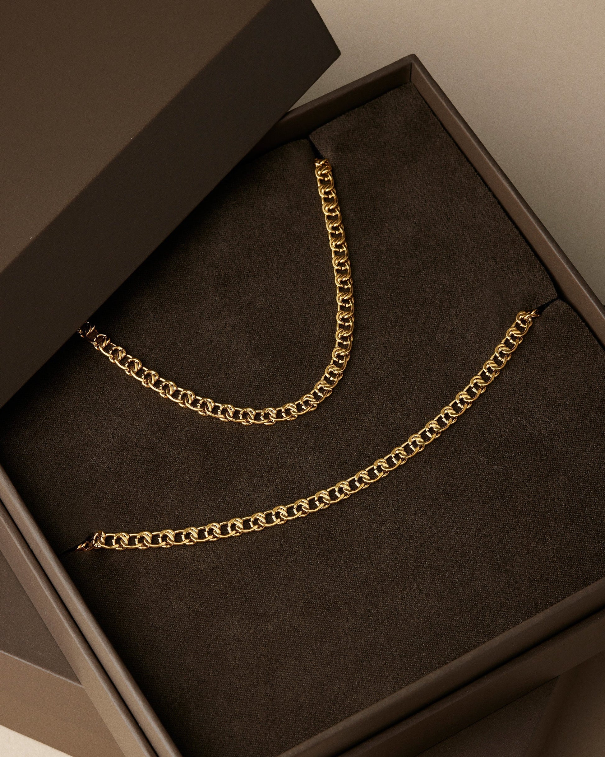 Warm glow in two pieces — a set that frames wrist and neckline with the same clean curb-chain look. Wear together for a defined, harmonious impression or separately when you want to keep it subtle. Durable, water-resistant, and easy to style — a sure choice from day to night.
