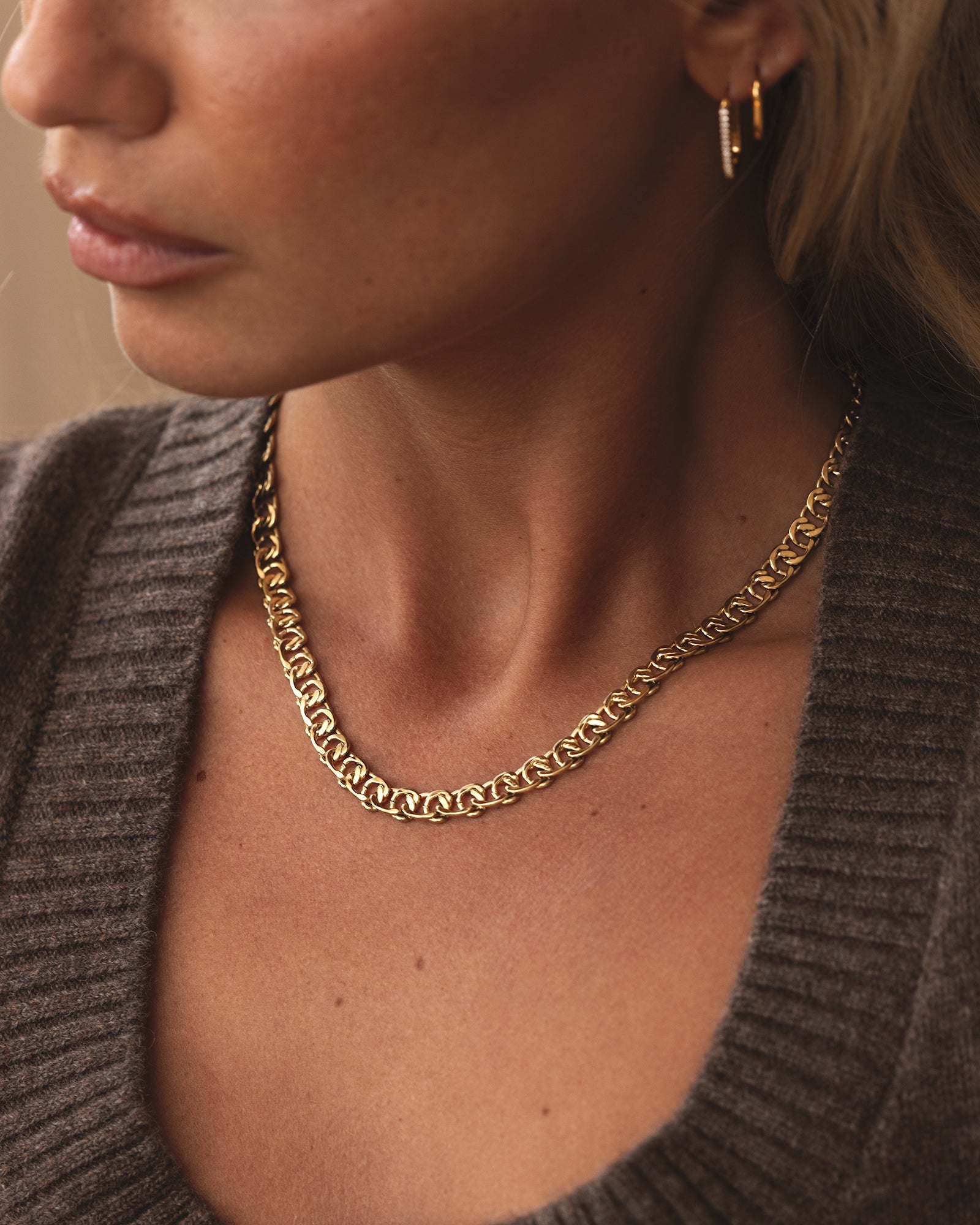 Mehr Kette, derselbe klare Ausdruck. Die Infinity Necklace in einer breiteren Panzerkette setzt einen markanten, harmonischen Akzent am Hals. Gefertigt aus Edelstahl mit 18K goldfarbener PVD-Beschichtung, die dem Alltagsgebrauch standhält und ihren Glanz bewahrt. Wasserbeständig und leicht anzupassen – die Verlängerungskette kann für eine perfekte Passform abgenommen werden.