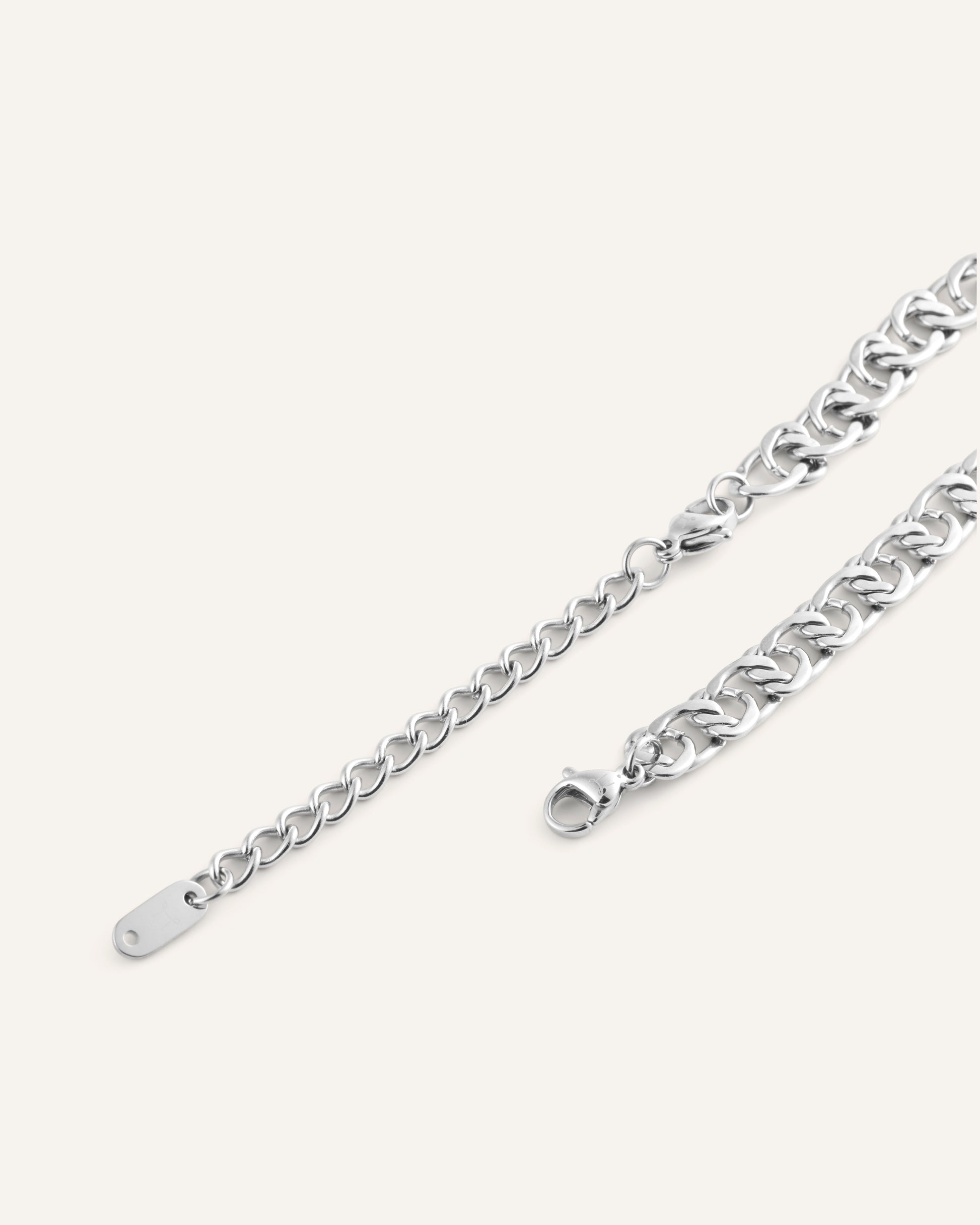 Infinity Bracelet ist ein klassisches Armband, dessen Glieder flach anliegen und so einen klaren, bequemen Sitz bieten. Trage es solo oder kombiniere es mit einer Uhr und weiteren Armbändern. Gefertigt aus rostfreiem Edelstahl in silberfarbener Ausführung – robust und wasserbeständig, damit Glanz und Finish lange erhalten bleiben. Die Verlängerungskette kann für eine individuelle Passform einfach entfernt werden.