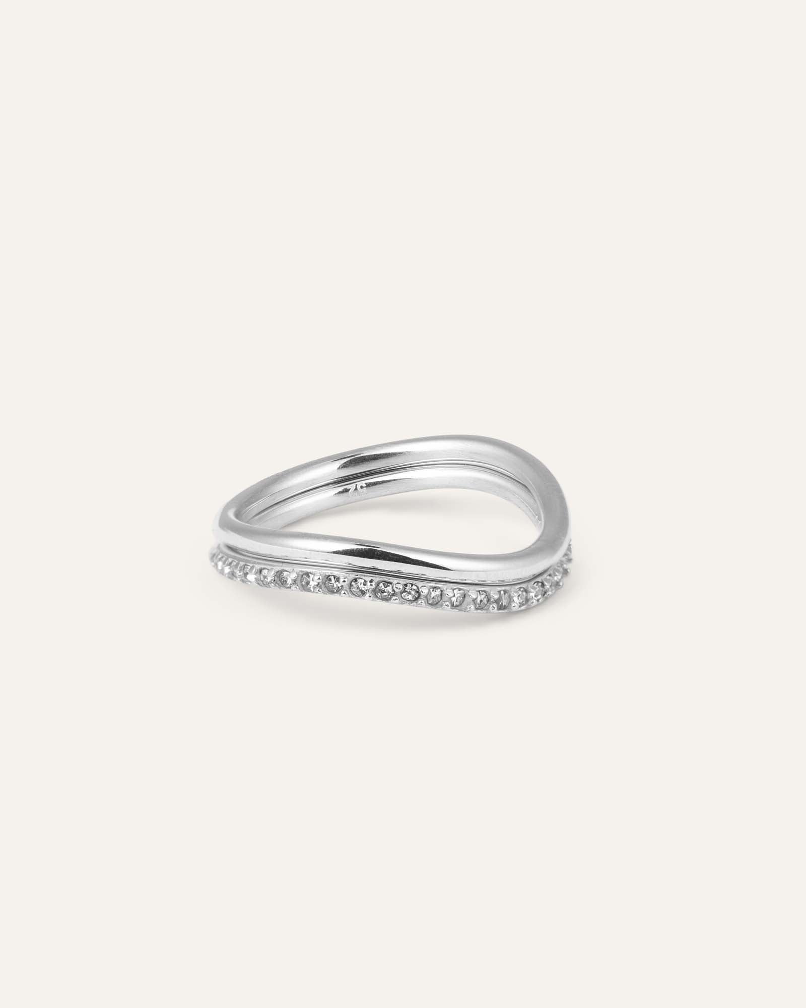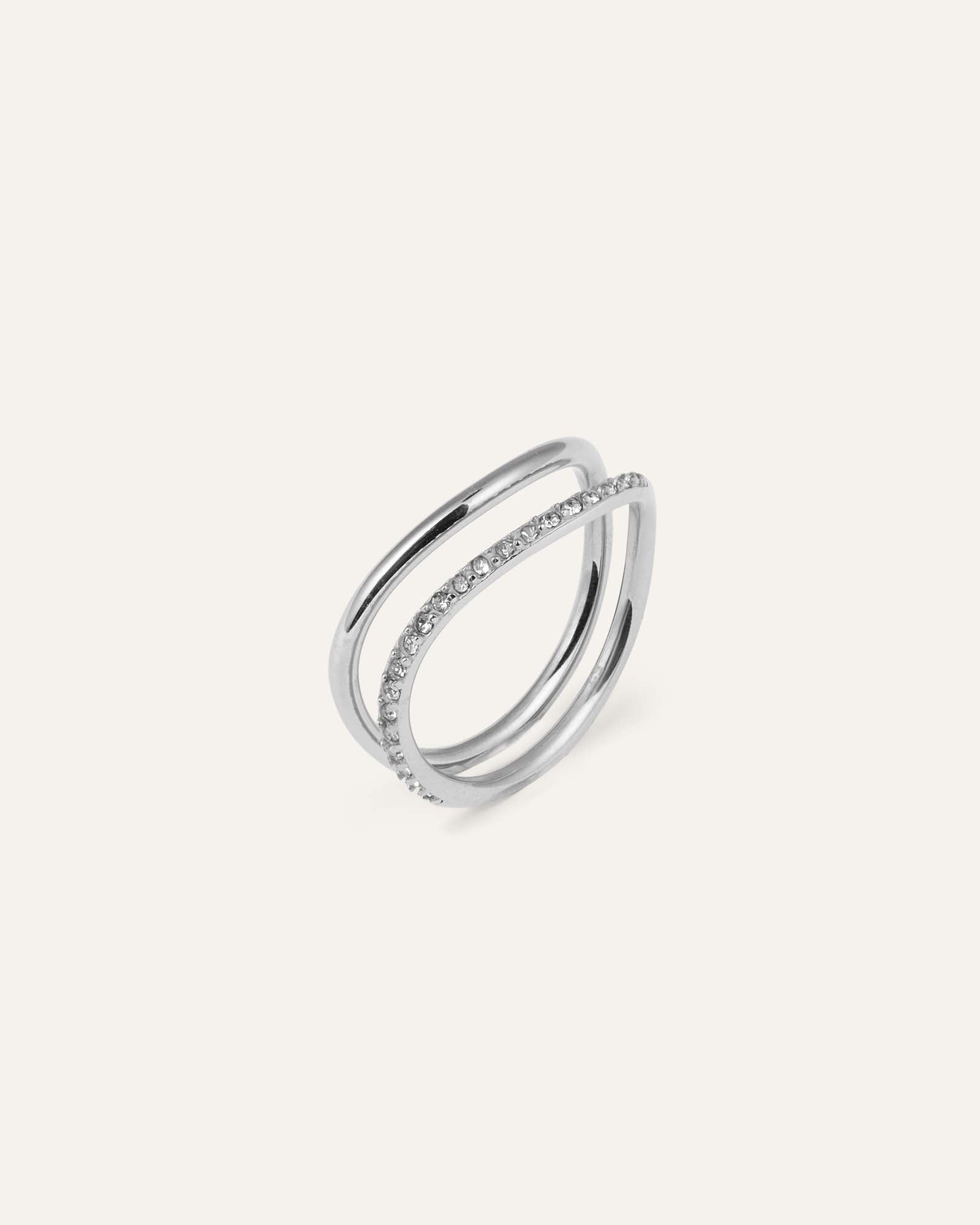Ein Set aus zwei Ringen in klarer, skandinavischer Minimalistik aus Edelstahl, das den Finger mit subtiler Eleganz umschmeichelt. Der klare Kristall sitzt sicher und funkelt ebenso strahlend – egal ob du im Pool schwimmst, im Sommerregen tanzt oder schnell unter die Dusche springst. Ein wasserfestes Design, das es dir ermöglicht, dein Selbstbewusstsein rund um die Uhr zu tragen.