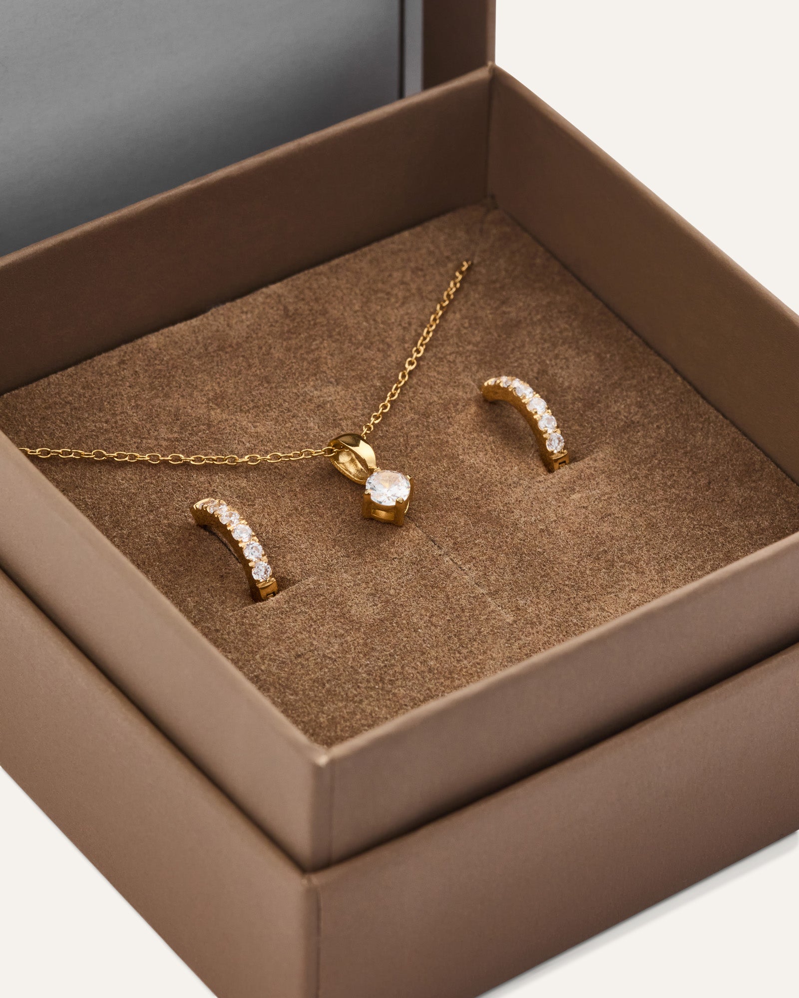 Ein elegantes Set mit einer Halskette und unseren meistverkauften Ohrringen. Entworfen für einen zeitlosen, klassischen Look. Das perfekte Geschenk für einen lieben Menschen – oder für dich selbst.