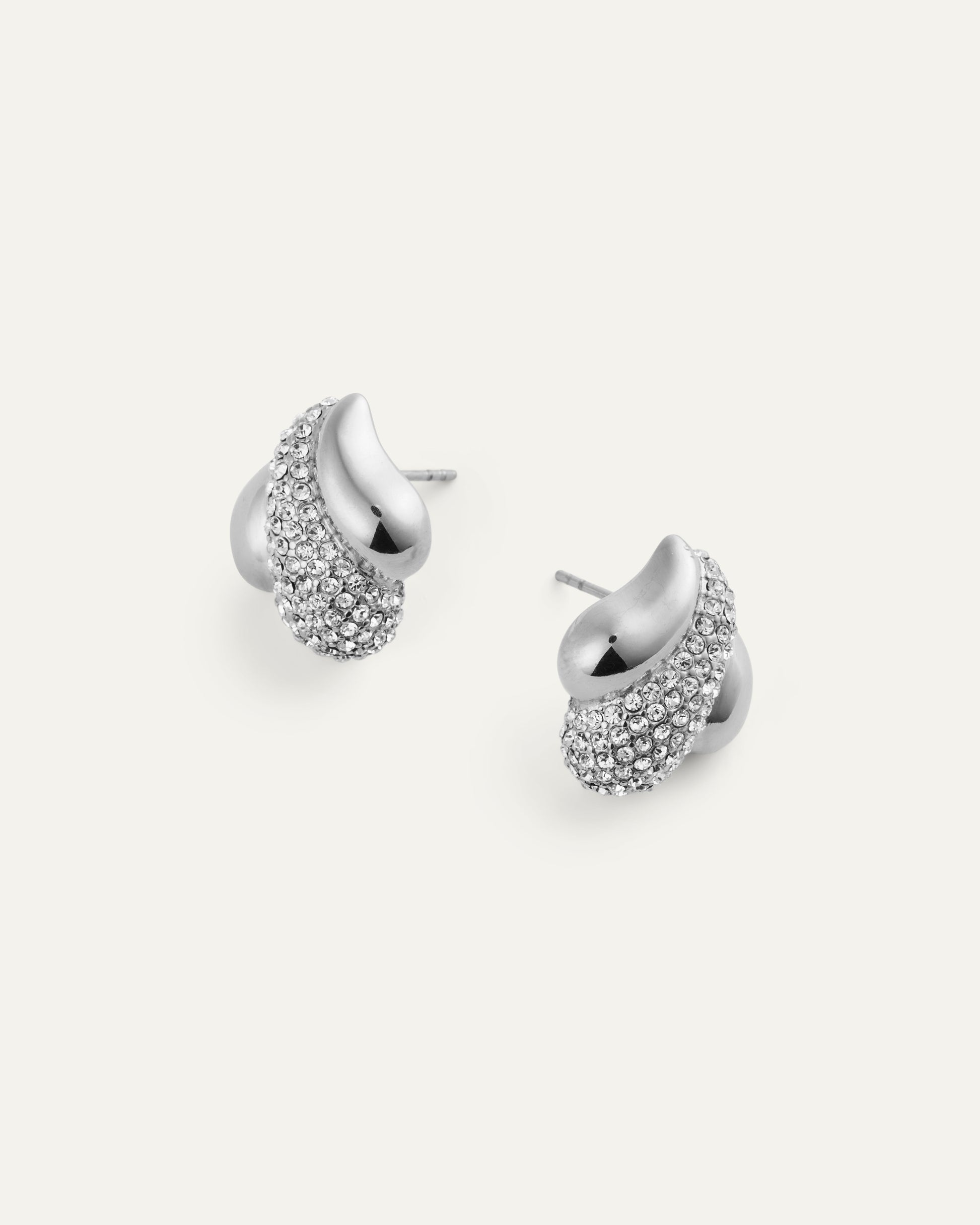 Skulpturierte Form mit sanften Kurven und eng gefassten weißen Preciosa-Steinen, die das Licht wunderschön einfangen. Die silberne Farbe sorgt für einen klaren, eleganten Look, der mühelos vom Tag bis in die Nacht funktioniert.