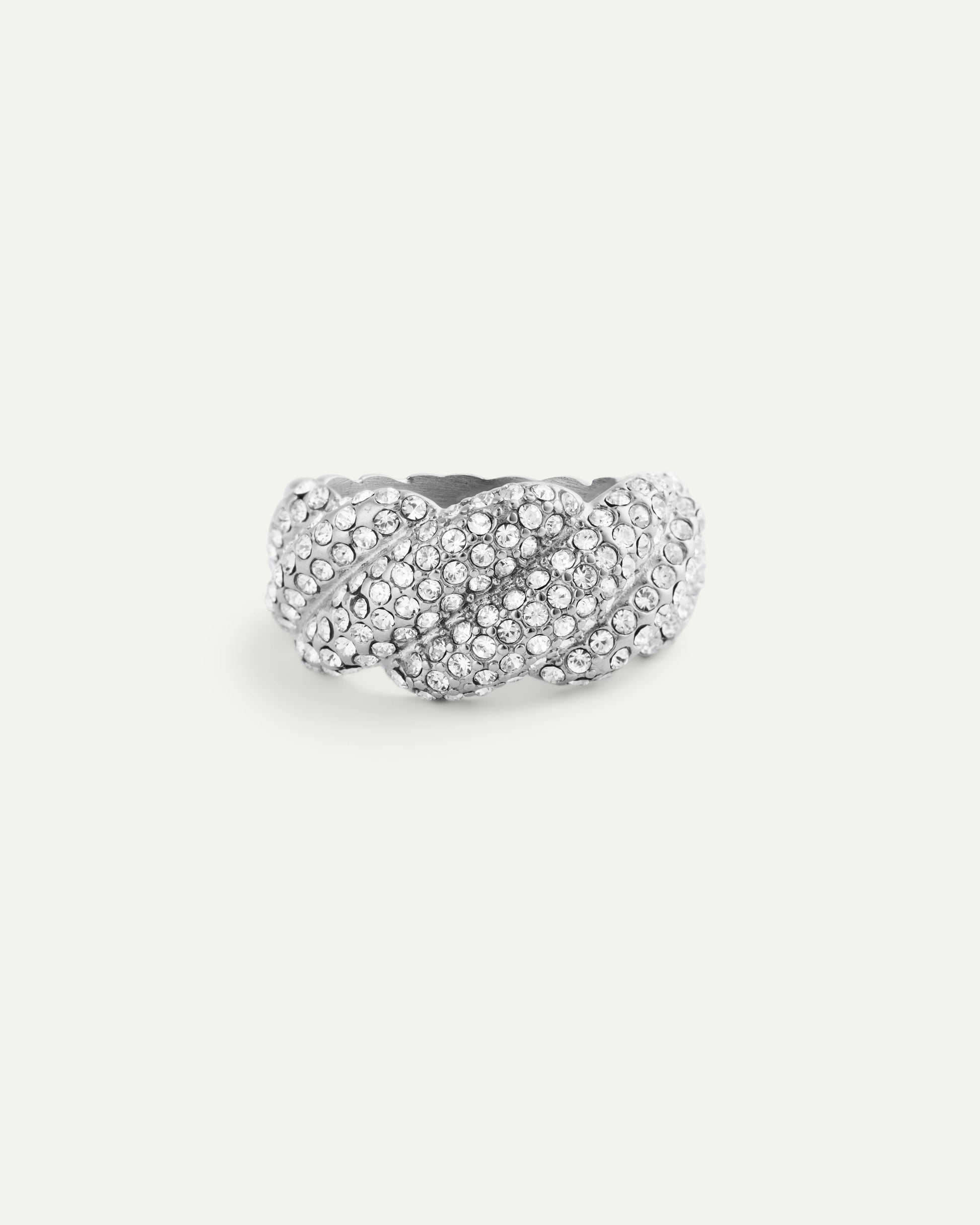 Eng gefasste weiße Preciosa-Steine in einem sanft gedrehten Profil sorgen für strahlende Brillanz und einen eleganten Ausdruck. Die silberne Farbe verleiht dem Stil eine kühle Note und lässt sich leicht kombinieren – vom Tag bis in die Nacht. Trage ihn einzeln oder gestapelt für zusätzlichen Glanz.