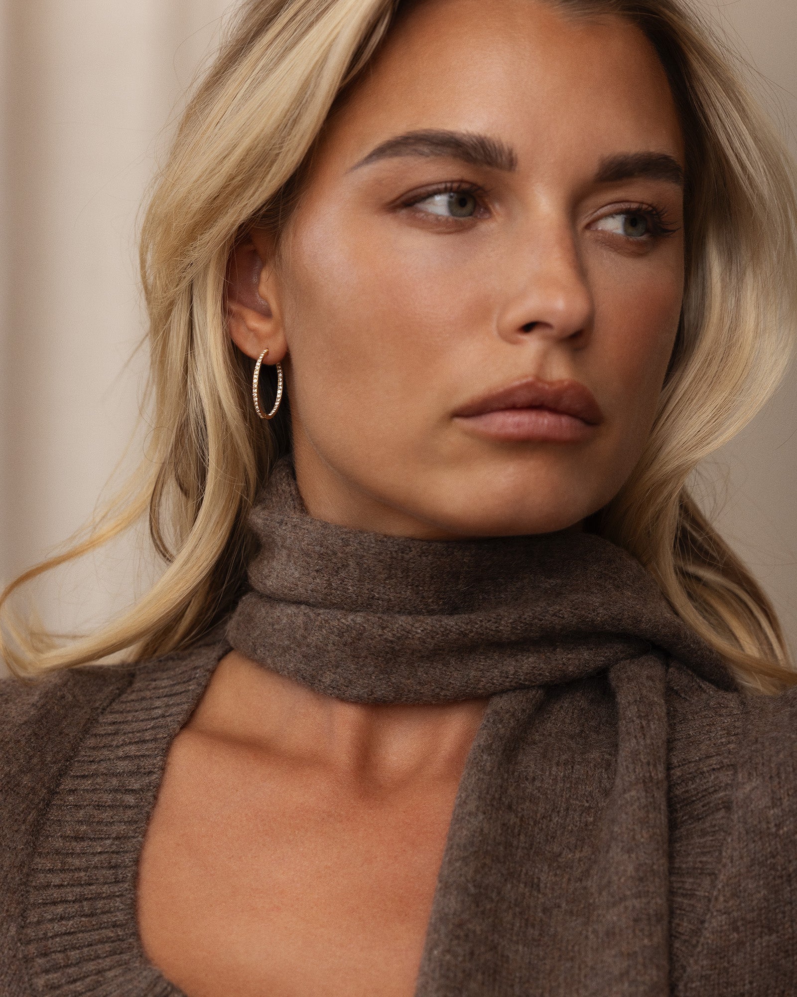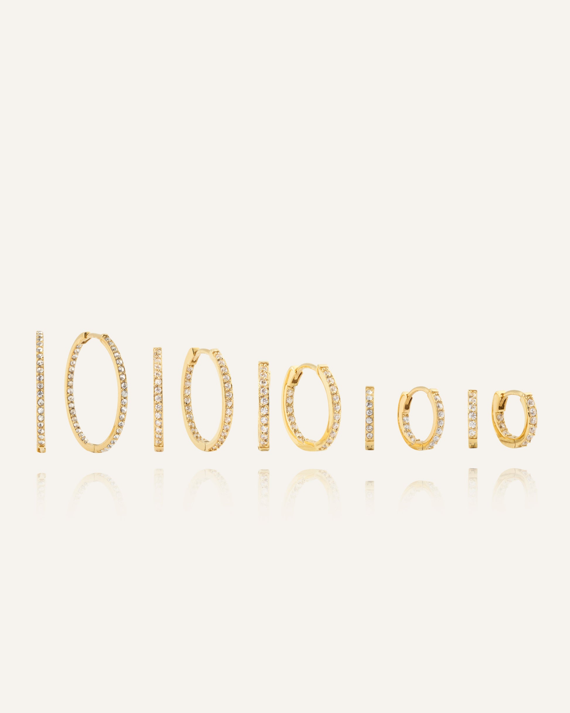 Sparkle Hoops schimmern sanft in einem Goldton. Die schlanken Creolen sind mit weißen kubischen Zirkonia besetzt, die bei jeder Bewegung das Licht einfangen. Leicht zu tragen, leicht zu stylen – vom Tag bis in die Nacht.