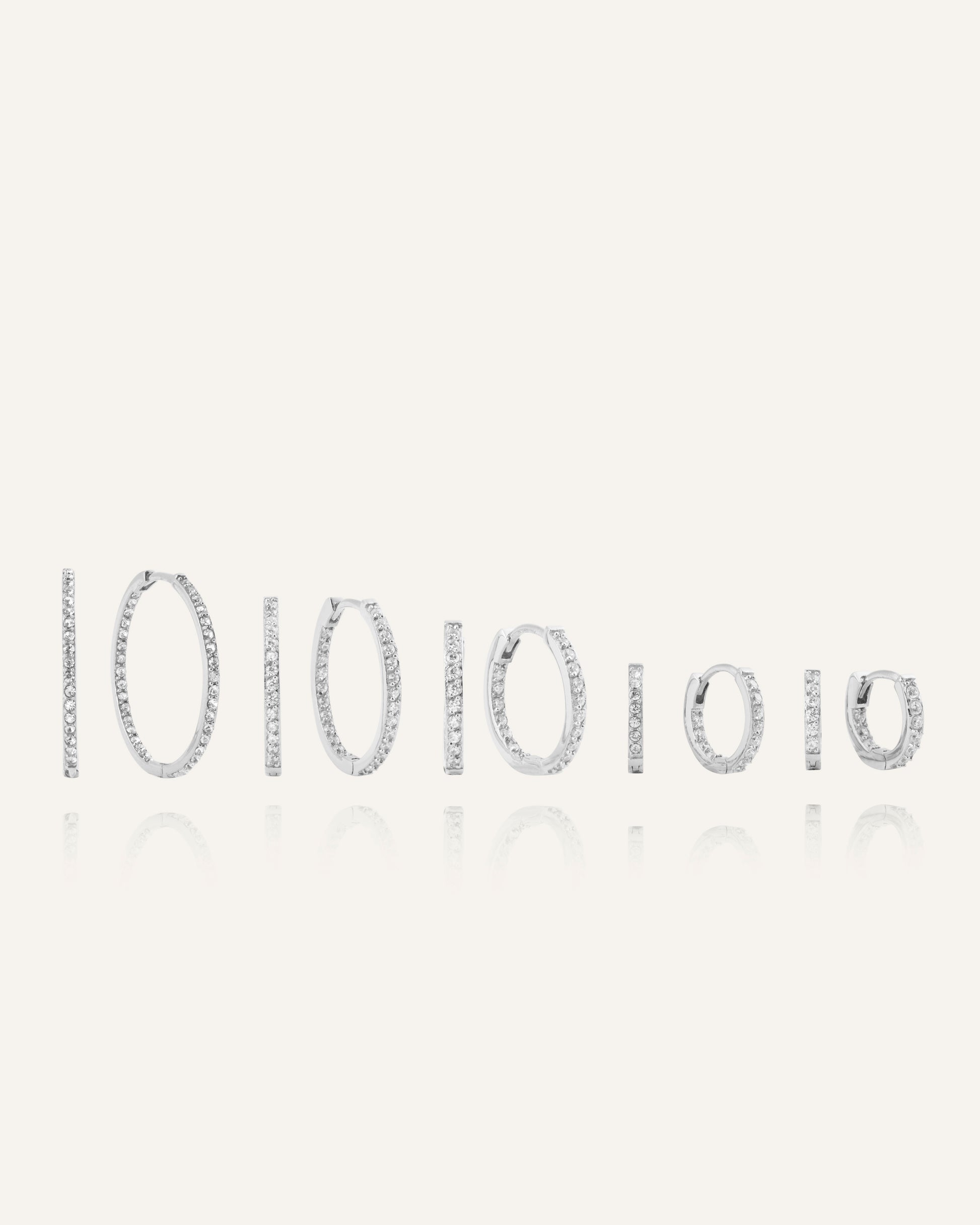 Sparkle Hoops schimmern sanft in einem Silberton. Die schlanken Creolen sind mit weißen kubischen Zirkonia besetzt, die bei jeder Bewegung das Licht einfangen. Leicht zu tragen, leicht zu stylen – vom Tag bis in die Nacht.